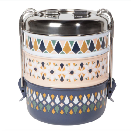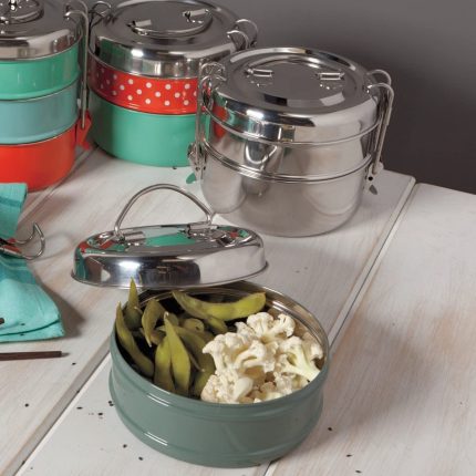 Part of the “Litterless Lunch” movement! This tiffin is made up of two stainless steel containers that stack together and securely snap closed. A convenient carrying handle makes this food storage system perfect for school lunches, toting to work, or for picnics and camping.