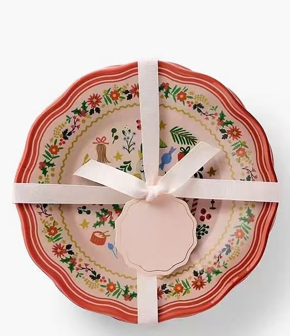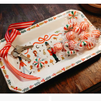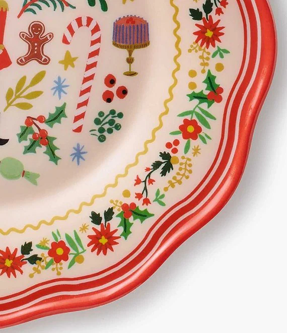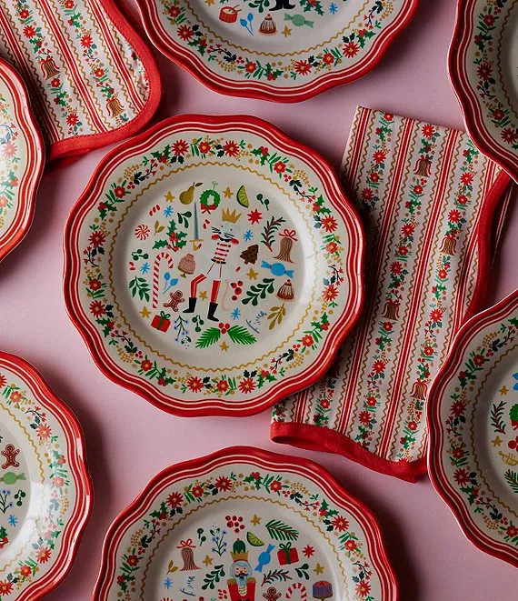 Packaged with a ribbon, this set of four holiday dessert plates features a sweet scalloped edge and four illustrations inspired by The Nutcracker.